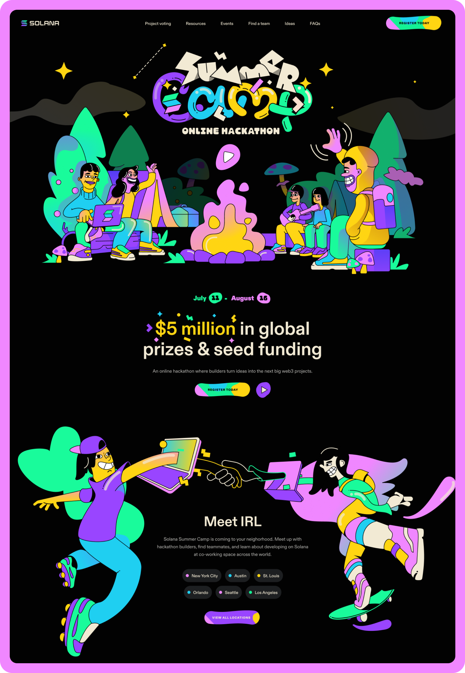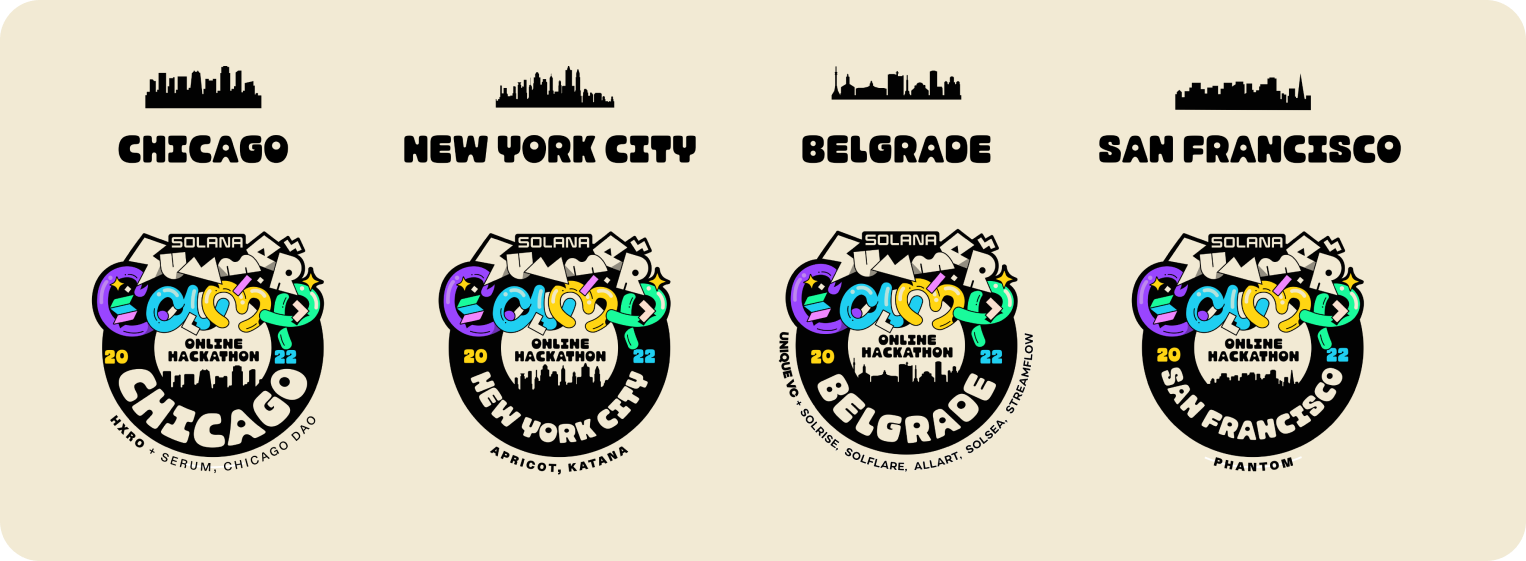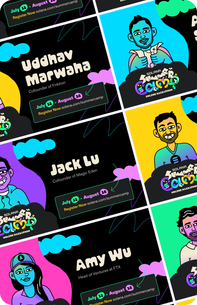 Together with the Solana Foundation we aimed to create a vibrant and engaging visual identity for the Solana Summer Camp Hackathon. This online global event, aimed at developers and builders, featured up to $5 million in prizes and seed funding. Our goal was to capture the essence of a fun and wacky, yet innovative summer camp vibe while appealing to a tech-savvy audience.